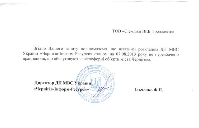 Мы решили проверить информацию, так как обслуживанием светофорных объектов официально занимается КП «Дорожно-строительное предприятие» Черниговского городского совета. Но, оказалось, в управлении транспорта нас «ошибочно» перенаправили. В штате ДП МВД «Чернигов-Информ-Ресурсы» не предусмотрено сотрудников, которые обслуживают светофорные объекты.