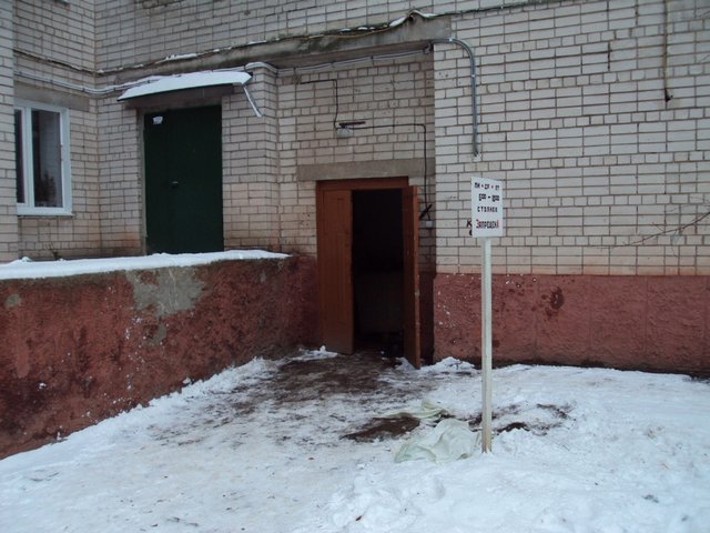 Вход в помещение с мусорными контейнерами. Молодой парень упал в паре метров от двери.