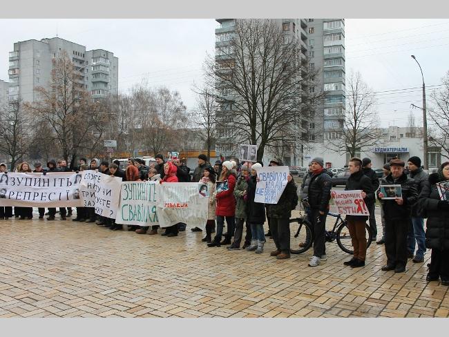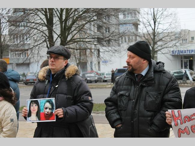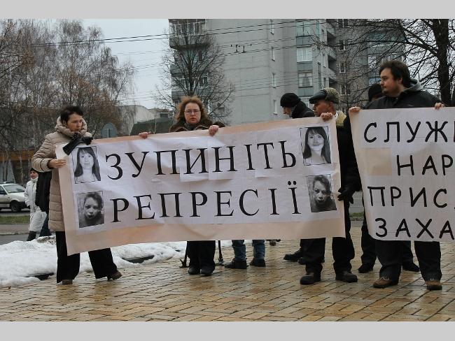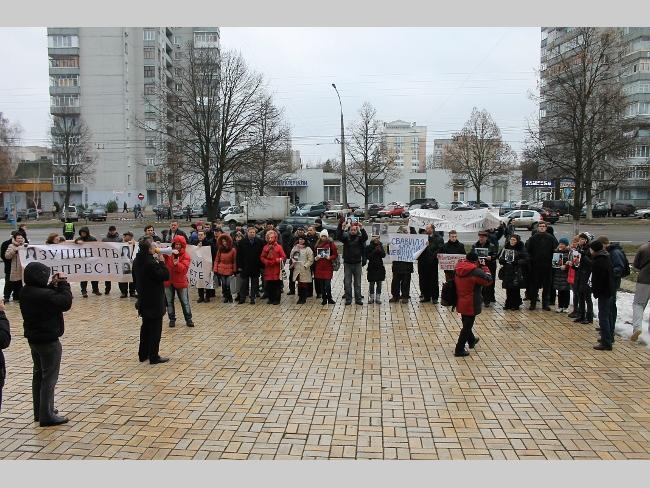 Присутствующие держали в руках фотографии избитой журналистки и плакаты: «Наступним можу бути я?», «Зупиніть репресії», «Свавільній владі суд громади».