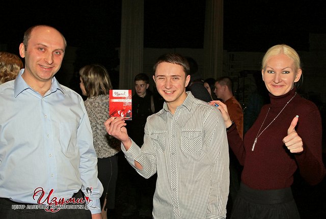 Специализация Центра лазерной косметологии – безопасное, эффективное и, главное, окончательное удаление лишних волос с любых участков тела. Результат – гладкая, шелковая кожа, прикосновение к которой может восхитить. Шесть зрителей, чьи ряд и место были указаны на карточках, которые вынули наугад, получили подарочные сертификаты от Центра «Изуми» на 250 грн. Счастливчики!