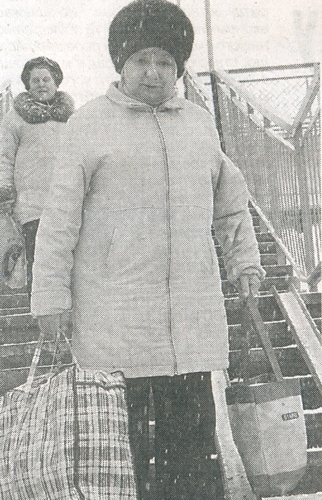 Жінка несе в руках дві важкі сумки і нарікає на керівництво Південно-Західної залізниці.
