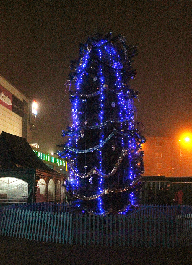 Первой зажигается елка возле «Мегацентра». Сияет она синим тусклым светом, создавая интим для влюбленных пар, назначающих свидание возле нее.