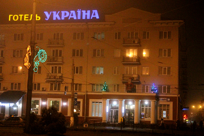 Вход в гостиницу «Украина» украшают две небольшие елочки и Дед Мороз.