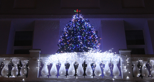 Елка на балконе Национального банка украшена, как в старые добрые времена – пятиконечной красной звездой.