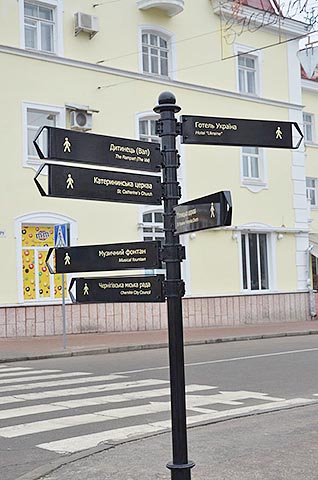 Загалом за цей час установили 27 об’єктів трьох рівнів. Спочатку з’явилися плани-контенти зі схемою міста, прив’язкою до місцезнаходження туриста та напрямками руху до головних туристичних місць. Далі — інформаційні стенди біля найвизначніших історичних пам’яток: будівель філармонії, міської ради, Нацбанку, Єлецького і Троїцького монастирів, бібліотеки ім. Короленка тощо. І нарешті ось тепер — вказівники в найбільш людних місцях у центрі українською та англійською мовами.
