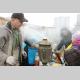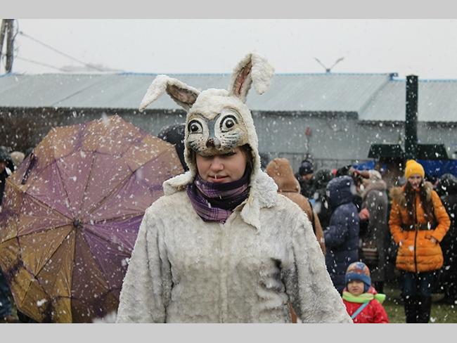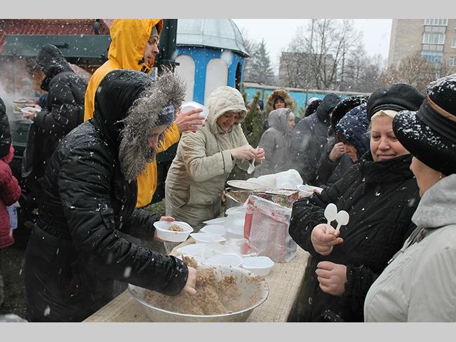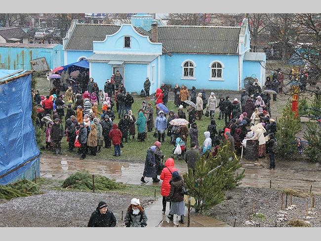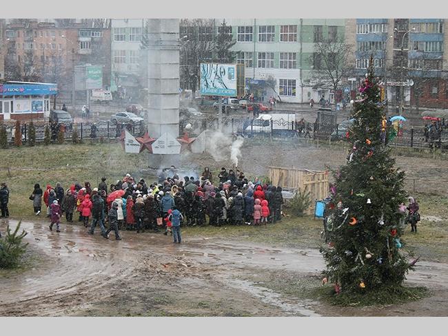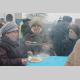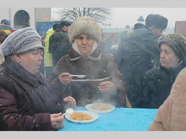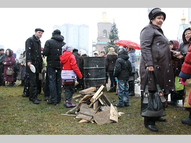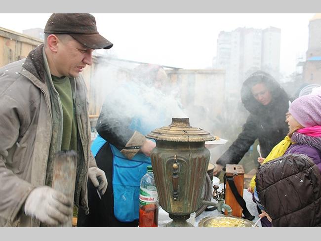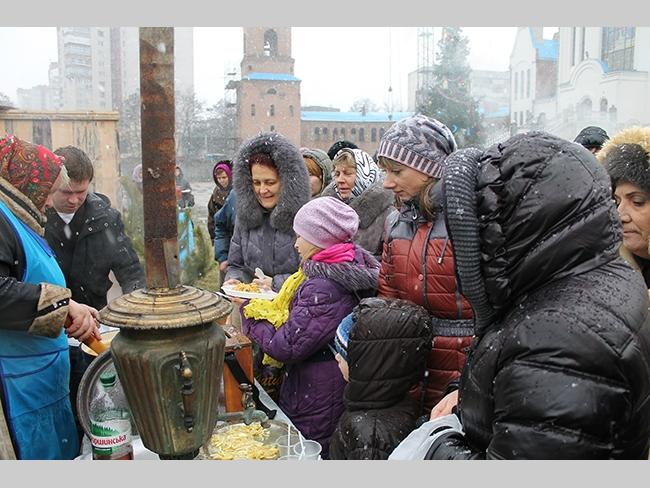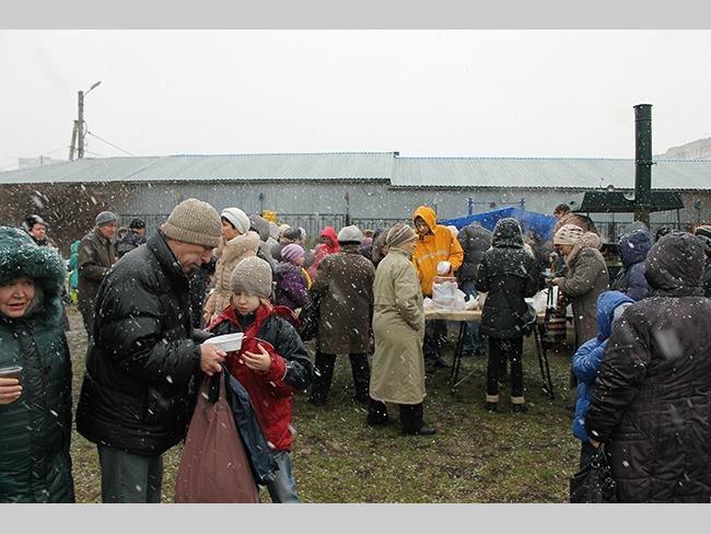 Невзирая на мокрую и холодную погоду, людей на праздник пришло много. Всех желающих угощали горячим чаем и кашей, а в торговых палатках можно еще было купить блинчики и пирожки.