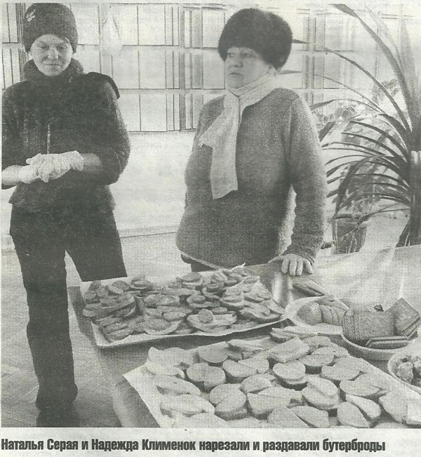 На пятом этаже тоже кормили народ. Бутерброды нарезали, а затем раздавали черниговская пенсионерка Надежда Клименок и жительница Щорса Наталья Серая. Она работает на пилораме. Из-за сильных морозов пилорама временно закрылась. Обе женщины были и на Майдане. Ездили на перекладных. До Нежина, а там уже электричкой на Киев.