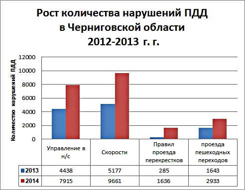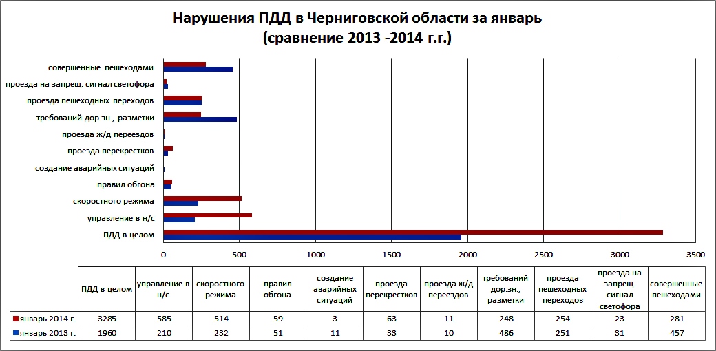 В целом за январь 2014 года в Черниговской области сократилось только нарушение ПДД пешеходами (из-за сильных морозов стали меньше выходить на улицу) и водители стали меньше нарушать дорожную разметку (скорее всего потому, что ее просто завалило снегом).