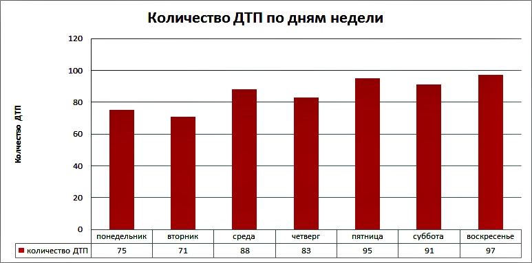 Если рассматривать количество ДТП по дням недели, то наиболее опасными являются пятница, когда после трудовой недели все едут домой; и воскресенье, когда «расслабившиеся» водители возвращаются с уик-энда.