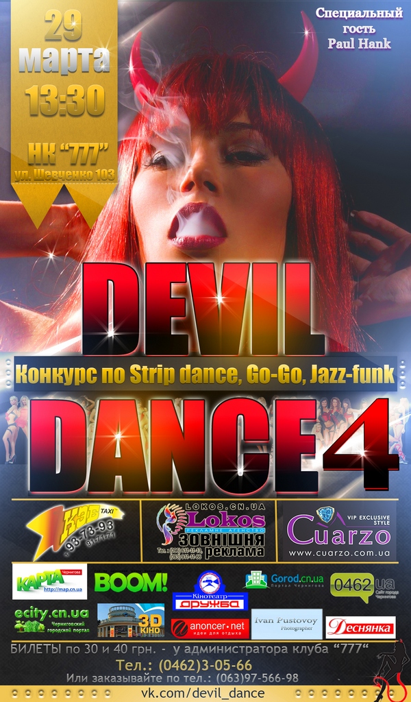 29 марта в 13.30 в Чернигове, в ночном клубе "777", по адресу ул. Шевченко 103, состоится одно из самых долгожданных событий года - Всеукраинский танцевальный конкурс "Devil dance 4": Jazz-funk, GO-GO, Strip dance, а также Go-Go (Pj) battle!