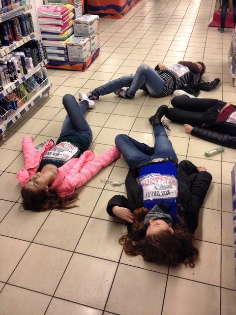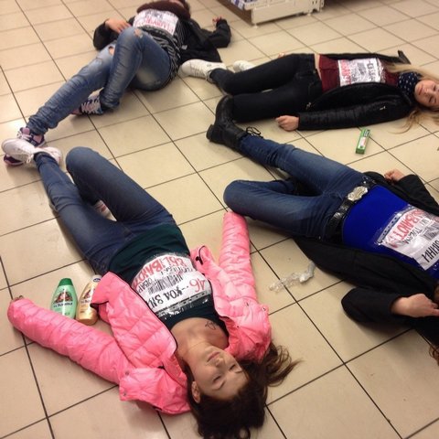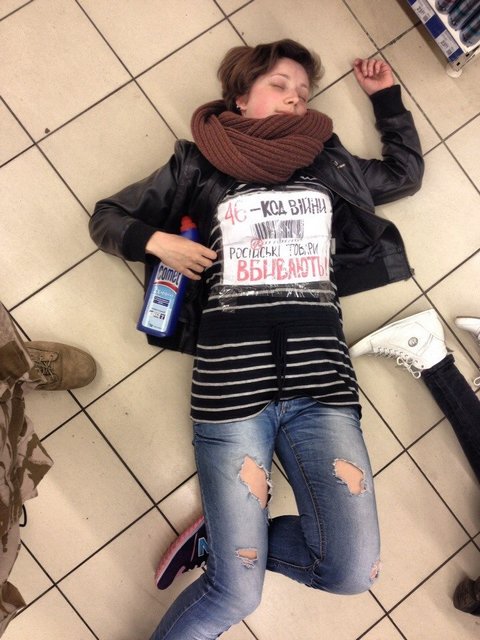 Вчера, 21 марта около 19.00 в магазине «Сильпо», что по улице Музыкальная, 1 черниговцы стали свидетелями необычного флешмоба. Несколько молодых девушек с прикрепленными поверх одежды плакатами, что содержали надписи «46 – код войны. Российские товары убивают!» падали на пол торгового зала, демонстрируя таким образом, свой протест против политики России в отношении Украины.