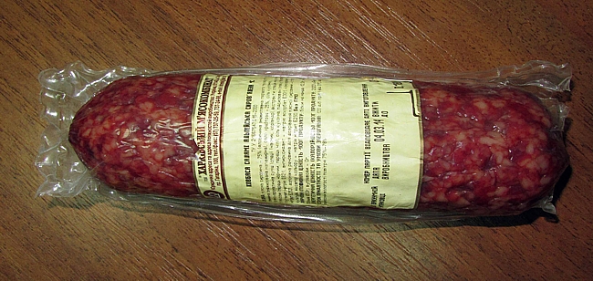 Выйдя из Инспекции по защите прав потребителей в Черниговской области, мы зашли в ближайший супермаркет, расположенный, как говорится, в «двух шагах», чтобы посмотреть, как там соблюдаются требования черниговской инспекции к маркировке колбасы. То, что мы увидели, нас совершенно не удивило. Вся сырокопченая и сыровяленая колбаса, висевшая на витрине, маркировалась по составу жира и белка как «не более» и «не менее»!