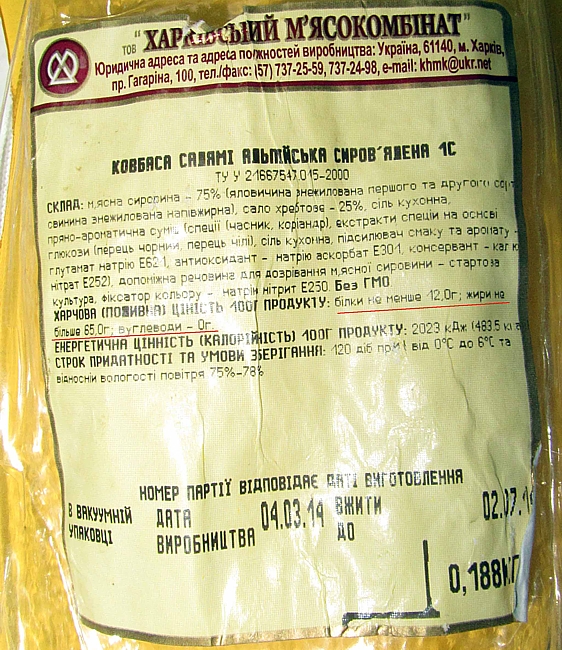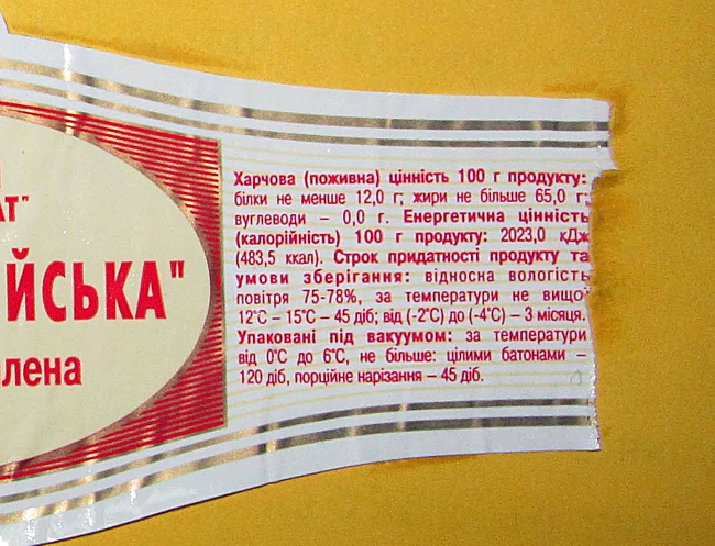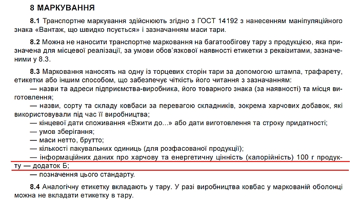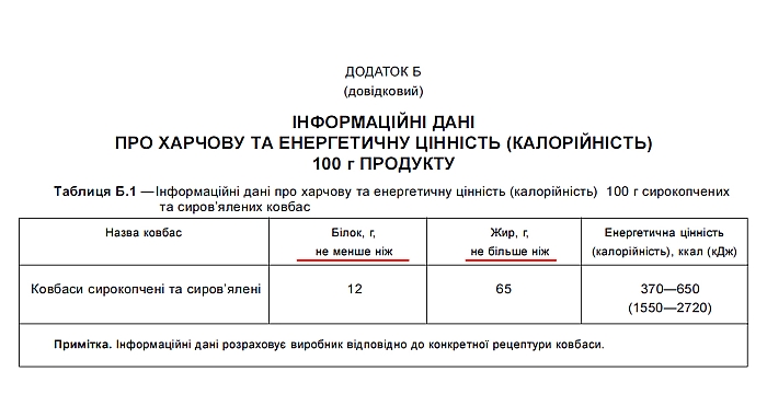 Что же касается требований ЗУ «О безопасности и качестве пищевых продуктов» к маркировке, то в статье 38 было прописано, что должна быть указана «калорийность и питательная ценность с указанием на количество белка, углеводов и жиров в установленных единицах измерения на 100 граммов пищевого продукта». В тех колбасных изделиях, которые реализуются в торговых точках Чернигова, производитель в маркировке указал количество белка, жира и углеводов на 100 гр. продукта, как «не более» и «не менее». Фактически, требования Закона и «Регламента» были соблюдены.
