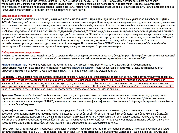 «Большинство производителей указывают жирность Браушнвейгской колбасы как не более 45%, что соответствует требованиям стандарта. В этом случае отклонения по жирности, связанные с использованием менее жирного мяса, вполне попадают в заявленные значения. Если же производитель указывает четкую цифру по жирности, то обязан соответствовать именно этому конкретному значению. Увы, при заявленной жирности в 42,4% в колбасе "Панська" содержалось 38,1% жира. У колбасы "Щирий кум" на этикетке обозначено 45% жира, а на самом деле – 36,8% жира. Такое несоответствие повлекло за собой снижение оценки».