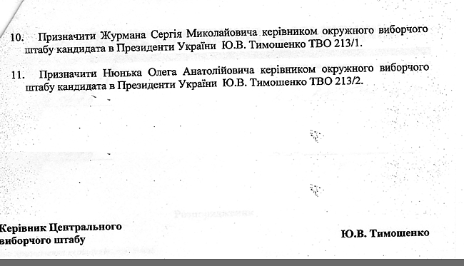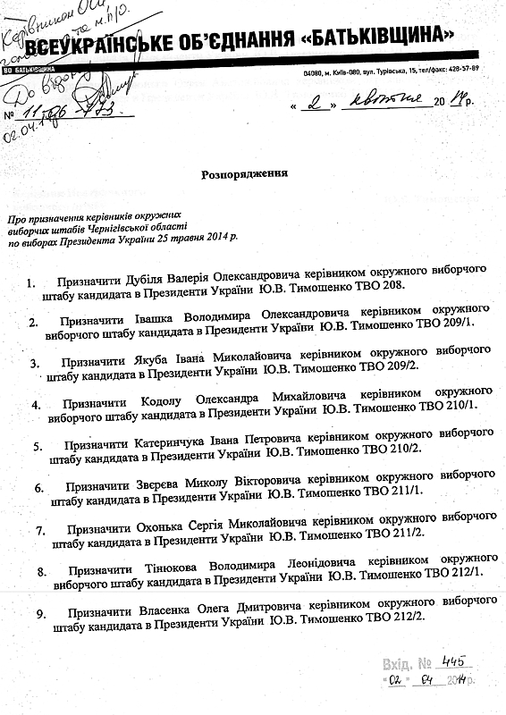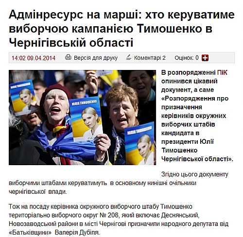 Но уже 9 апреля, на том же сайте «Події в коментарі» были опубликованы списки руководителей предвыборных штабов в Черниговской области кандидата Юлии Тимошенко. Кроме фамилии Валерия Дубиля, которая стояла под №1, как фамилия руководителя избирательного штаба по 208 округу, в списке были фамилии недавно назначенных на высокие должности членов команды «Батькивщины»: главы Черниговской ОГА Владимира Ивашко, его заместителя – Сергея Журмана, председателя облсовета Николая Зверева и других. А это было уже явным использованием административного ресурса, поскольку большинство в списке – новоназначенные чиновники областного уровня, члены партии «Батькивщина».