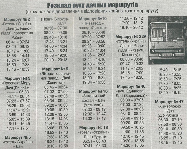 Кожен рік з середини квітня починаються масові «візити» міських жителів на дачі. Триває цей пік навантаження на громадський транспорт майже півроку. Спеціалісти управління транспорту і зв’язку міськради запевняють, що плідно попрацювали, аби всі бажаючі мали змогу регулярно діставатися дачних масивів за десятком основних напрямків. Адже більшість міських жителів мають городи (а це майже 27 тисяч ділянок) розміщені в межах міста чи неподалік: у Рівнопіллі, Березанці, Жавинці, Киїнці та інших.