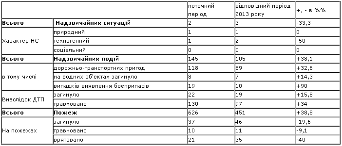 21.04.2014 року о 07 год. 06 хв. сталася пожежа неексплуатуємої будівлі господарчого призначення. Вогнем знищено покрівлю. Ймовірна причина - підпал. Збиток - 10 000 грн. Врятовано матеріальних цінностей на суму 150 000 грн.