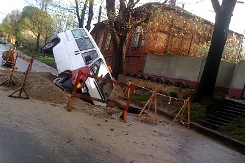 Утром 23 апреля на участке ул. 1-го Мая между школой №5 и Пяти углами водитель отправил свою машину прямо в яму, вырытую коммунальщиками для проведения ремонтных работ водопровода. Жертв нет.