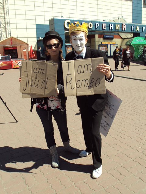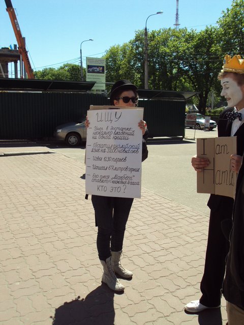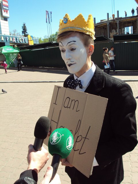 Вчера, 25 апреля, примерно в 14 часов дня, возле ТЦ «Мегацентр» внимание прохожих привлекал молодой человек в белом гриме и короне на голове. В руках он держал табличку «I am Hamlet». Вместе с ним была девушка, которая подходила к прохожим и, по указанной на плакате информации о человеке, просила людей назвать писателя, к которому эта информация относится. Как оказалось, это был так называемый перфоманс в честь 450-летия со дня рождения Вильяма Шекспира. Об этом журналистам интернет портала gorod.cn.ua рассказал актер из Харькова Дмитрий Обедников.