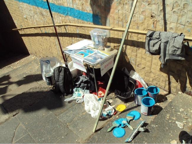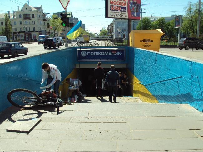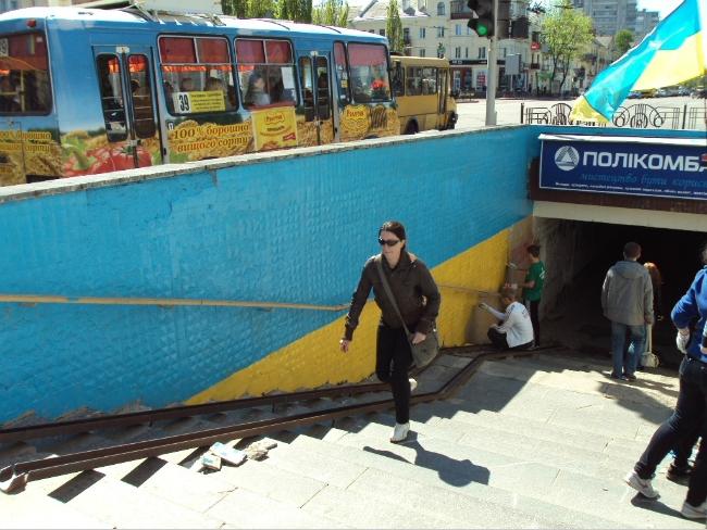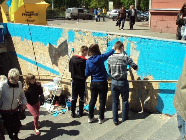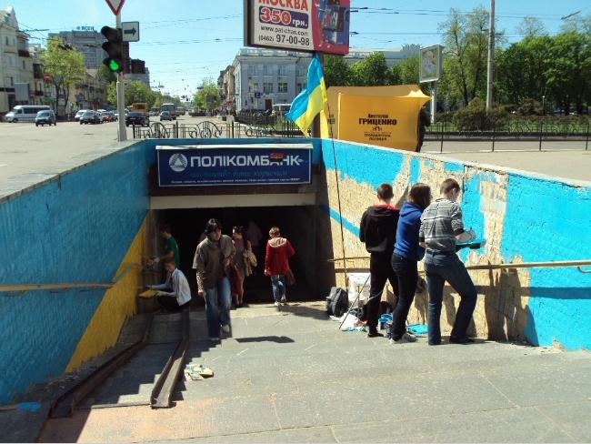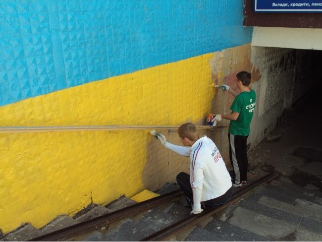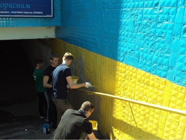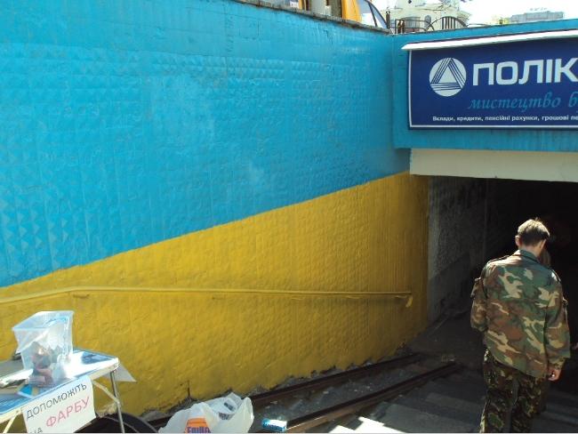 Общественные активисты продолжают приводить в порядок и перекрашивать в желто-синие цвета подземный переход возле гостиницы «Украина». Вчера, 25 апреля 2014 года ребята перекрасили стены еще одного выхода из перехода, который находится на стороне гостиницы.