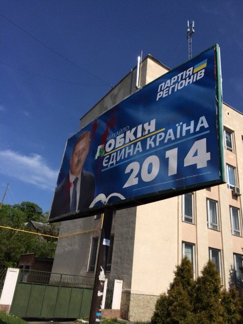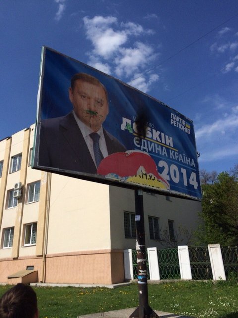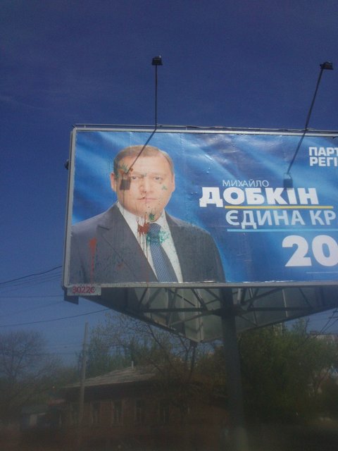 Местные активисты не выдержали. И так как живьем Добкин не приехал, а личность его одиозная решили хотя бы его портрет облить зеленкой.