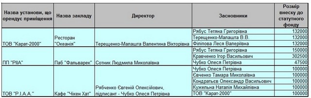 Серед засновників ТОВ «Р.І.А.А.» (Чікен Хат) значиться Кужельна Наталія Михайлівна, але чи доводиться вона родичкою Андрію Кужельномому, з’ясувати не вдалось. Паб Фальварек є власністю співзвучного підприємства ПП «РІАА», а ТОВ «Карат-2000» (Ресторан Океан) являється співзасновником ТОВ «Р.І.А.А.» (Чікен Хат). З цього напрошується висновок, що заклади належать одній і тій же групі осіб.