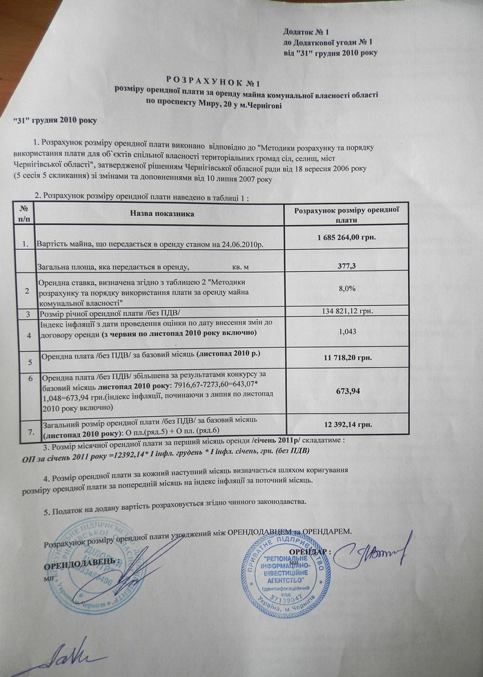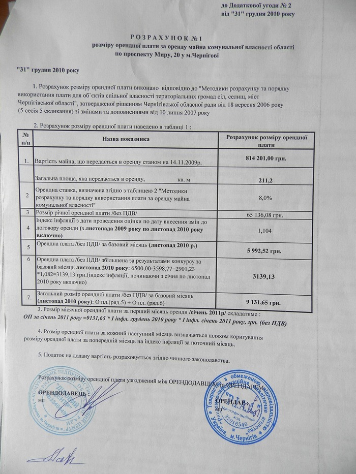 Розрахунок розміру орендної плати за оренду майна комунальної власності області по проспекту, Миру,20 у м.Чернігові