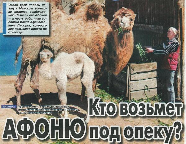 Около трех недель назад в Менском зоопарке родился верблюжонок. Назвали его Афоней 4 - в честь работника зоопарка Ивана Афанасьевича Пискуна, которого все называют просто по отчеству.