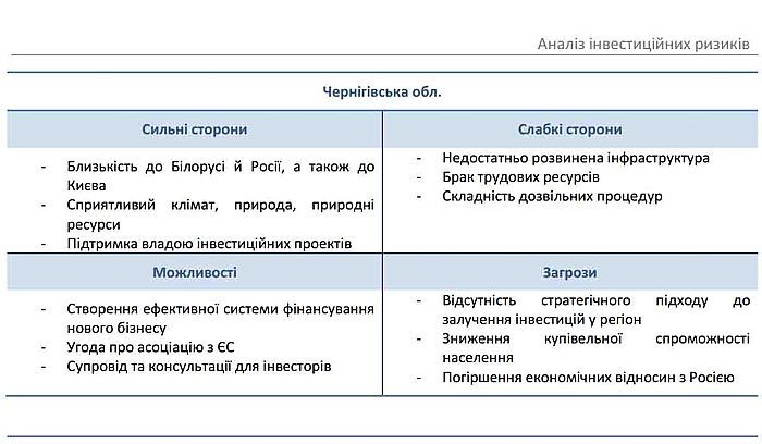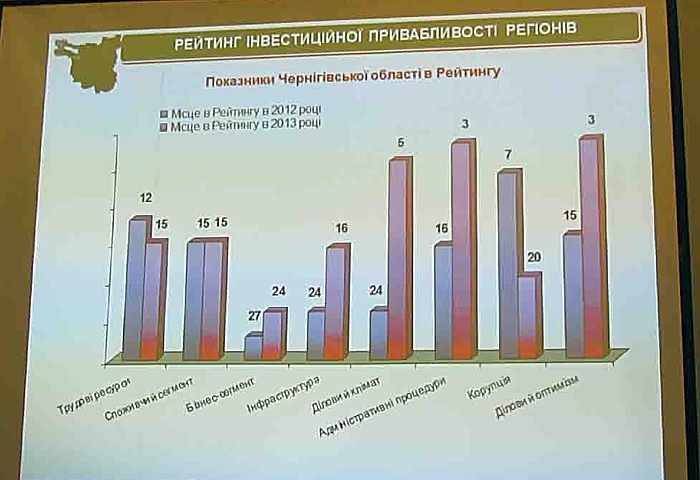 – Черниговская область входит в десятку привлекательных для инвестиций областей и занимает 9-е место. По показателю «Деловой климат» в 2013 году Черниговщина занимает 5-е место против 24-го в 2012 году. По фактору предоставления административных услуг – 3-е место (16-е в 2012 году). По уровню защиты прав собственности в 2013 году область заняла 4-е место в рейтинге. По фактору налоги и сборы регион занимает 6-е место. Мы уверены, что существенное улучшение рейтинга отображают оптимистические надежды предпринимателей в отношении экономических перспектив региона. Только один показатель, в сравнении с предыдущим периодом у нас ухудшился. Это – коррупция, – считает заместитель начальника управления по вопросам развития предпринимательства и инвестиционной деятельности Департамента экономического развития облгосадминистрации Тамара Залозная.