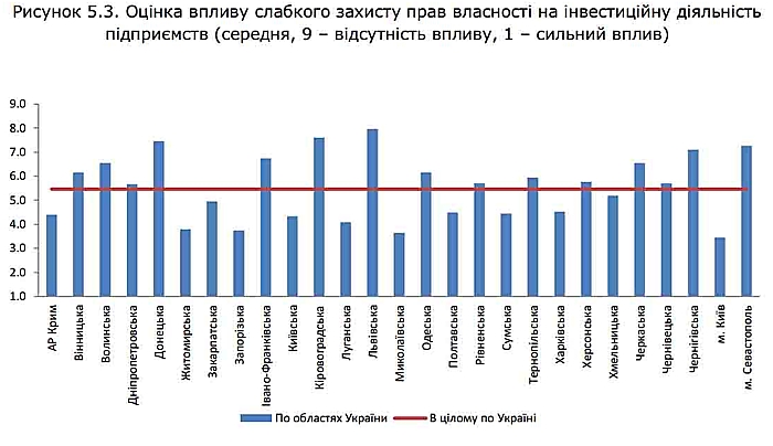 В то же время, по мнению респондентов на Черниговщине защита прав собственности – на высоком уровне. Она – гораздо выше среднего по Украине. Больше всего страдают от нарушения прав собственности предприниматели Киева (3,46), Николаевской (3,65), Запорожской (3,75) областей, АР Крым (4,4) , а также Сумской (4,45), Полтавской (4,5) и Харьковской (4,52) областей. Частично объяснить этот факт для АР Крым можно нарушением прав собственности в отношении земельных участков, поскольку проблема землевладения достаточно остро стоит на полуострове; для Николаевской, Запорожской и Харьковской областей причина может заключаться в распределении сфер влияния (и соответственно и собственности) на большие промышленные предприятия, расположенные в регионе. Меньше права собственности, в разрезе регионов, нарушаются, по мнению респондентов, в Донецкой (7,47) , Кировоградской (7,60) , Львовской (7,96) областях и г. Севастополе (7,27).