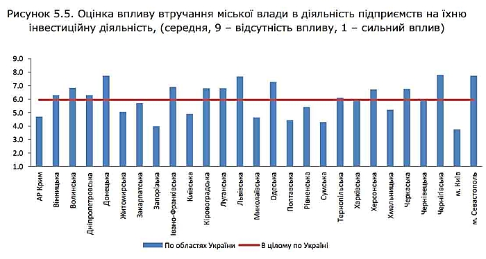 В общем, респонденты 12 из 27 регионов считают, что местные власти довольно активно вмешивается во внутренние дела предприятий, что, в свою очередь, отрицательно сказывается на эффективности осуществления инвестиций. Больше всего жалуются на деятельность городской власти респонденты г. Киева (3,75 балла), Запорожской (4,0), Сумской (4,30) и Полтавской (4,45) областей. Не считают, что вмешательство городских властей оказывает негативное влияние на инвестиционную деятельность, респонденты Черниговской (7,80), Донецкой (7,73), Львовской (7,68) областей и г. Севастополя (7,73).