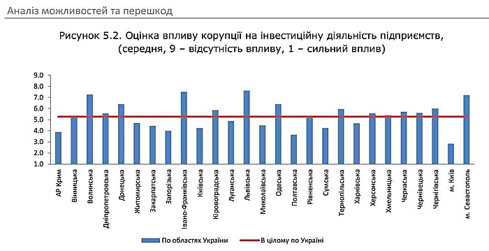 По оценкам респондентов, высоким уровнем коррупции характеризуются г. Киев (2,83), Полтавская (3,65) , Запорожская (4,0), Киевская (4,24), Сумская (4,25) области и АР Крым (3,90). В общем, в 13-ти из 27-ми регионов наблюдается уровень коррупции выше среднего (в т.ч. и в Черниговской области). Низкой или почти отсутствующей называют коррупцию в своем регионе предприниматели Львовской (7,6), Ивано-Франковской (7,5 ), Волынской (7,25), Одесской (6,4), Донецкой областей (6,4 ) и Севастополя (7,2).
