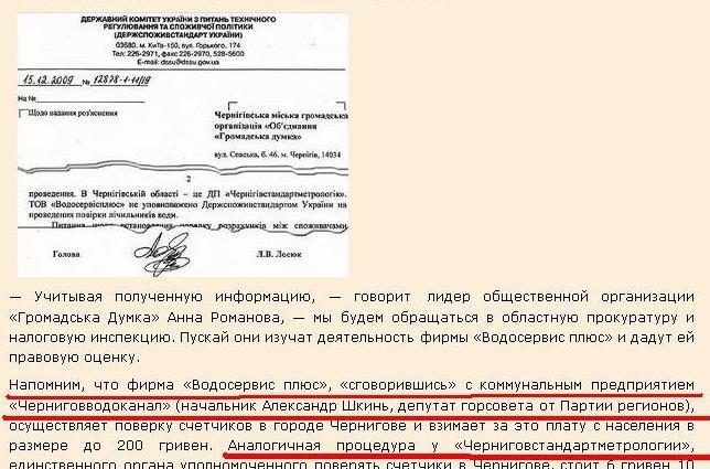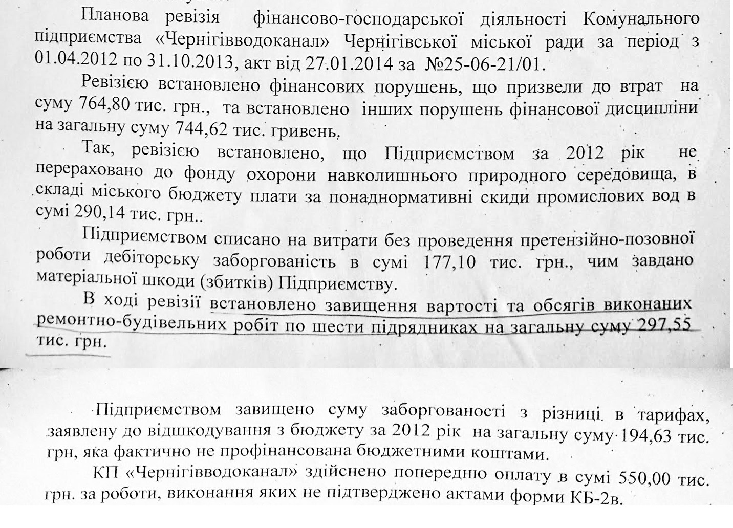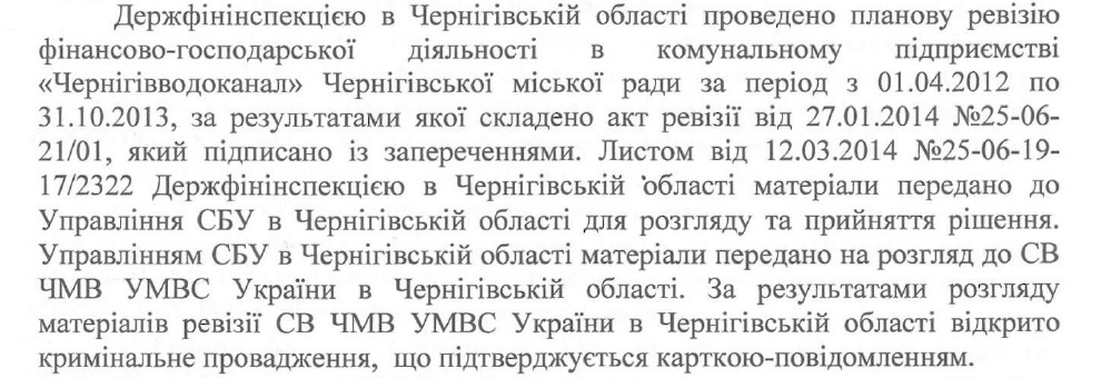 Когда готовился материал, стало известно, что следственным отделом городского управления милиции на основании Акта ревизии от 27.01.2014 года, который был составлен Госфининспекцией в Черниговской области, по результатам проверки финансово-хозяйственной деятельности в коммунальном предприятии «Черниговводоканал», открыто криминальное производство.