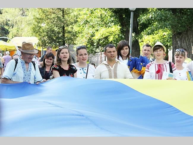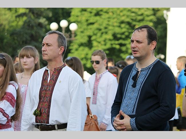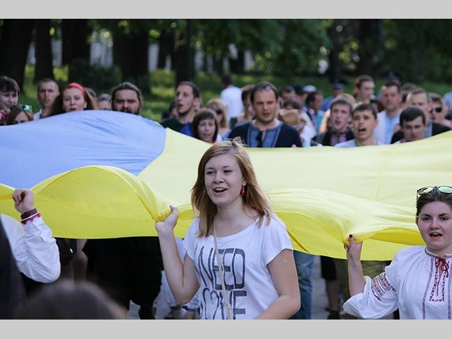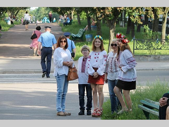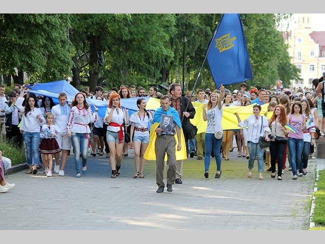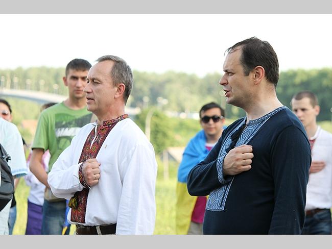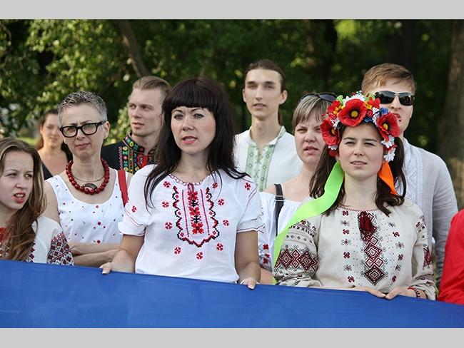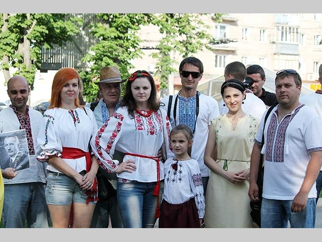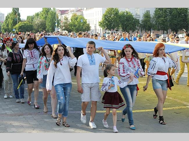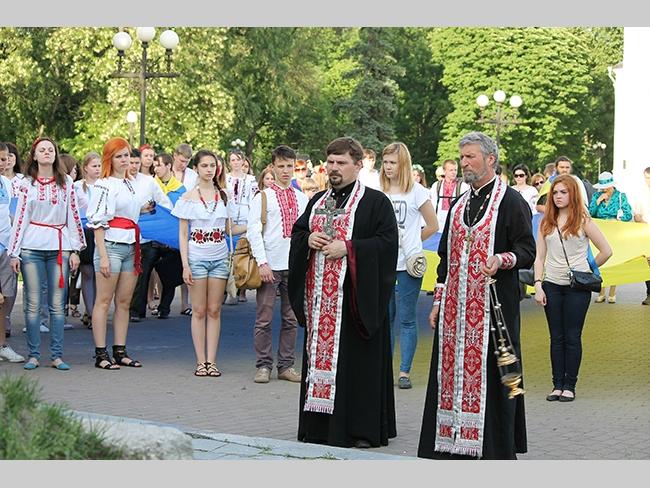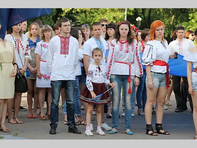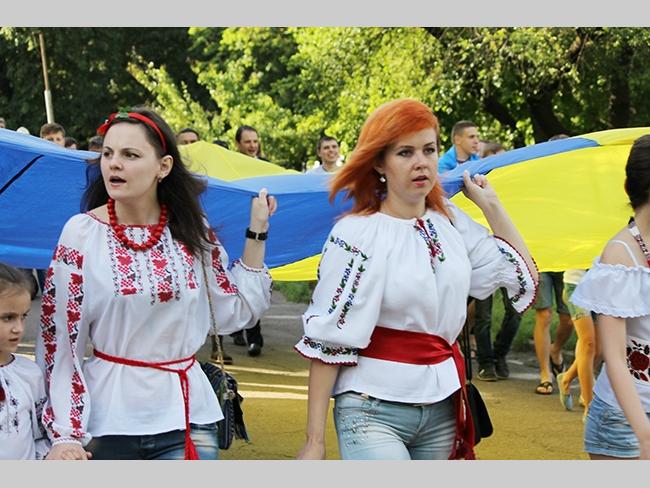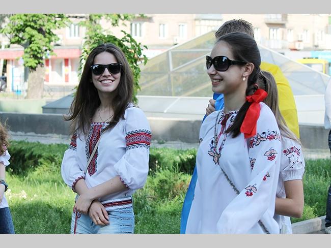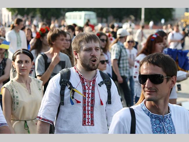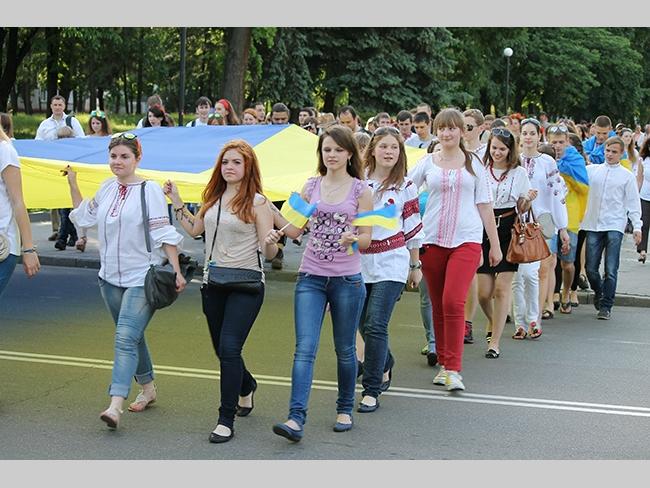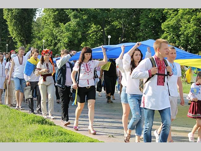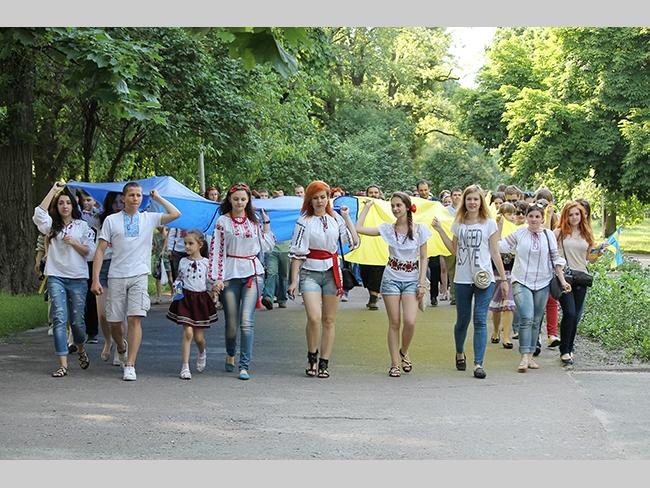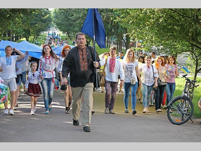 Около полусотни молодых юношей и девушек, в национальных вышиванках, которые одна другой краше, собрались в парке, напротив «Мегацентра». Развернув огромный национальный флаг Украины, участники марша двинулись центральной улицей города к Екатерининской церкви. В марше принял участие и депутат Верховного Совета Украины от Всеукраинского объединения «Свобода» — Руслан Марцинкив.