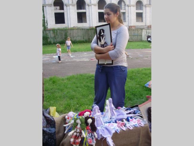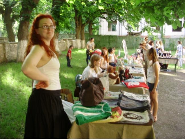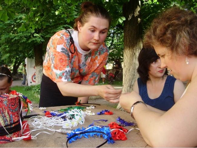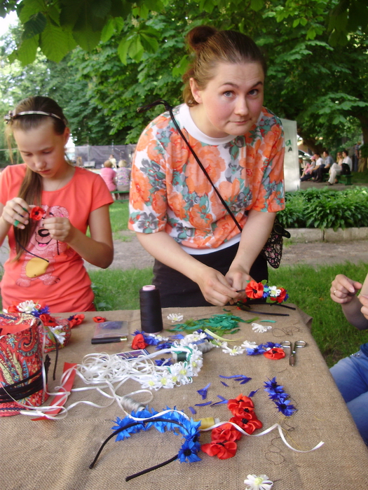 А ось і обіцяний майстер-клас для тих хто любить попрацювати руками. Олександра Стародуб вчить дівчат робити вироби зі стрічок. Жіночки та дівчатка плетуть віночки, прикраси у волосся та інші вироби, назви яких я не наважуюся ідентифікувати, та активно прикрашають ними себе одразу після виготовлення.