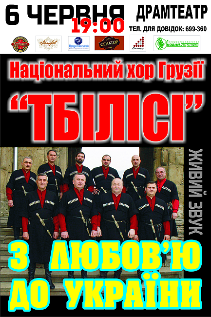 В начале июня состоится первая часть тура «Тбилиси». Вторая запланирована на осень – по городам Восточной и Южной Украины. Национальный хор Грузии «Тбилиси» - это 12 вокалистов: шесть теноров, три баритона и три баса. Руководитель коллектива - заслуженный деятель искусств Грузии, лауреат Государственной премии Роберт Гоголашвили. Директор хора - кавалер Ордена Чести Заза Мамаладзе. В репертуаре ансамбля - грузинские народные песни, песни грузинских композиторов, а также известные мелодии из кинолент (в частности, «Мимино», «Скрипач на крыше»), из Бродвейских мюзиклов. А специально для тура Украиной в репертуаре хора «Тбилиси» появилась песня на стихотворение Тараса Шевченко «Реве та стогне Дніпр широкий». Но это еще не все песенные сюрпризы, которые ожидают украинскую публику во время двухчасовых концертов «С любовью к Украине».