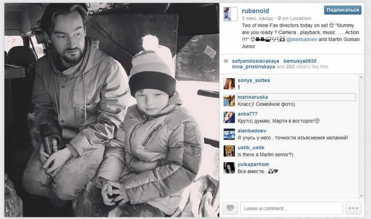 А еще выложила фото, где размещены на одном снимке известный украинский клипмейкер Алан Бадоев, она подписала его как «Два моих любимых директора, камера, Action!» Обе эти записи Тани прокомментировал Алан Бадоев, а ее знакомые написали: «Класс! Семейное фото», «Все вместе…»