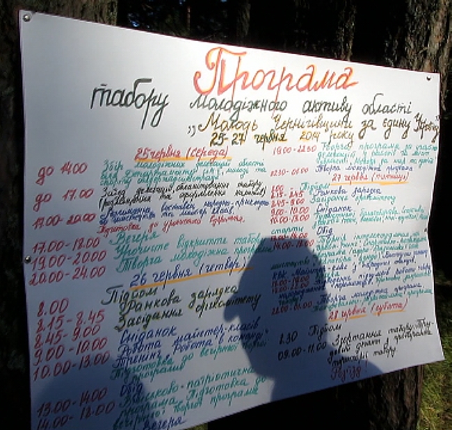 Что же касается программы лагеря, то она – довольно насыщенная. Торжественное открытие лагеря молодежного актива области «Молодь Чернігівщини за єдину Україну» состоялось вечером 25 июня. После этого – концертная программа Черниговского филармонического центра, танцевально-развлекательная шоу-программа с участием диджеев Чернигова. В течение всего дня заезда – выставки народно-прикладного искусства, мастер-классы художников и гончаров.