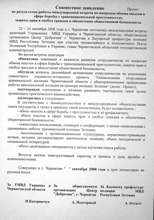 В среду, 25 сентября в Чернигове, как говорили раньше, «с дружественным визитом» находилась делегация Лыунаской префектуры полиции МВД Эстонской Республики. Возглавил ее префект полиции Айвар Отсалт. Вместе с делегацией в Чернигов прибыл и Яан Хейн, Чрезвычайный и Полномочный Посол Эстонской Республики в Украине. В этот раз коллеги-полицейские привезли в Чернигов не только свой опыт, но и «материальную часть»: сертификат на пять ноутбуков и полиграф. Это оборудование на безоплатной основе будет в ближайшее время передано Черниговским представителям правопорядка. Но даже и не подарок главное. Главное в том, что такие встречи помогают руководителям нашего Управления МВД оценить работу милиции в области, как бы со стороны, через призму чужого опыта. И, нужно отдать должное, выводы делаются правильные. А для того, чтобы все, что рассказали эстонские полицейские о своей работе, не сочли вымыслом, восемь сотрудников милиции из Чернигова будут направлены на стажировку в Лыунаскую префектуру полиции. Там они смогут воочию убедиться в эффективности методов работы полиции Эстонской Республики.