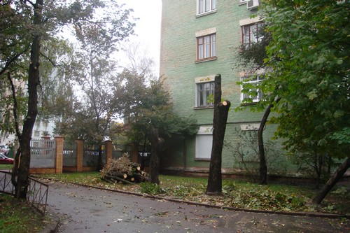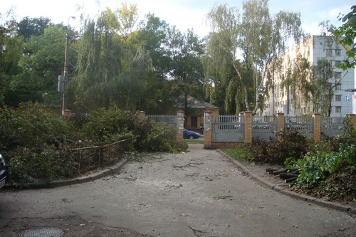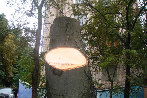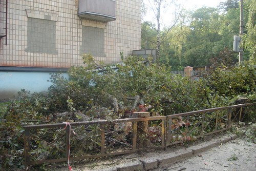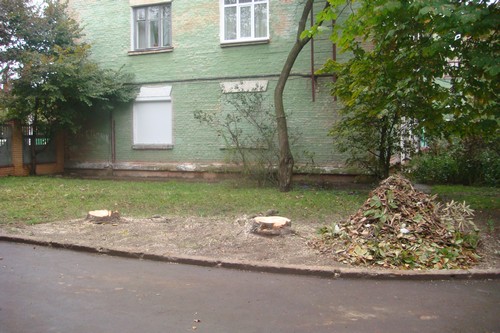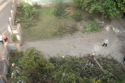 - В течение 4 дней (понедельник, вторник, среда, четверг) в нашем дворе срубили 16 деревьев. Люди, которые проводили вырубку совали нам в лицо документы, где было сказано, что ущерб от вырубки зеленых насаждений возмещен в казну города, в размере 4 000 гривен. Жильцов не поставили в известность о том, что происходит. Все в шоке от того, что вырубили уникальный зеленый пятачок. Это легкие нашего двора. Видите, напротив оживленная автотрасса, из за чего большая загазованность. А эти деревья защищали наш двор. Благодаря им тут есть хоть немного свежего воздуха. Здесь гуляют мамы с детьми, старики и инвалиды, теперь они буду дышать пылью.
