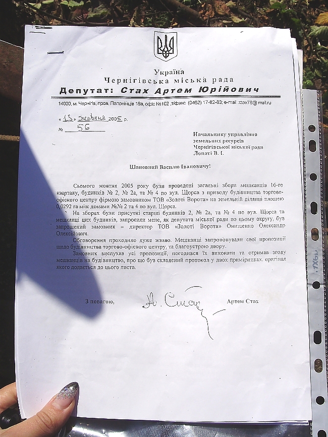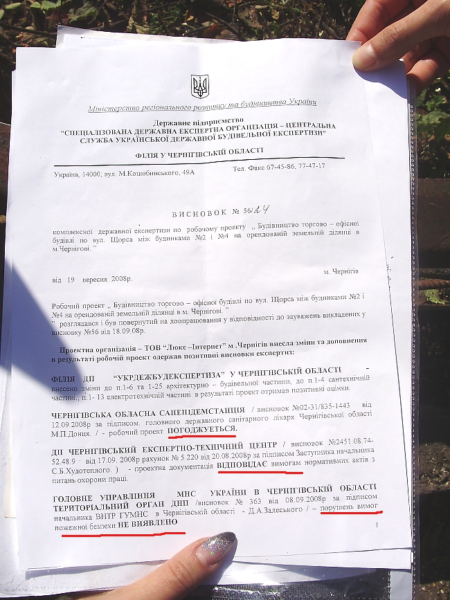 - И еще я хочу сказать, что когда они начинают махать всеми этими бумажками и «дозволами», где участвуют все, начиная от черниговской областной санэпидемстанции, и заканчивая укрдежрбуд экспертизой руки опускаются. Все наши власти дали разрешение на уничтожение такое красоты. Могу добавит. что они давно уже заглядывались на наш двор – ведь это такой лакомый кусок в центре города! Когда вчера производилась последняя вырубка, вот этих деревьев строители просто кидались на нас с топорами. Говорили что мы мешаем им работать. Хамили, матерились и оскорбляли нас. Один из строителей замахнулся на меня и оттолкнул, на видео это хорошо видно.