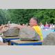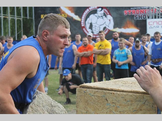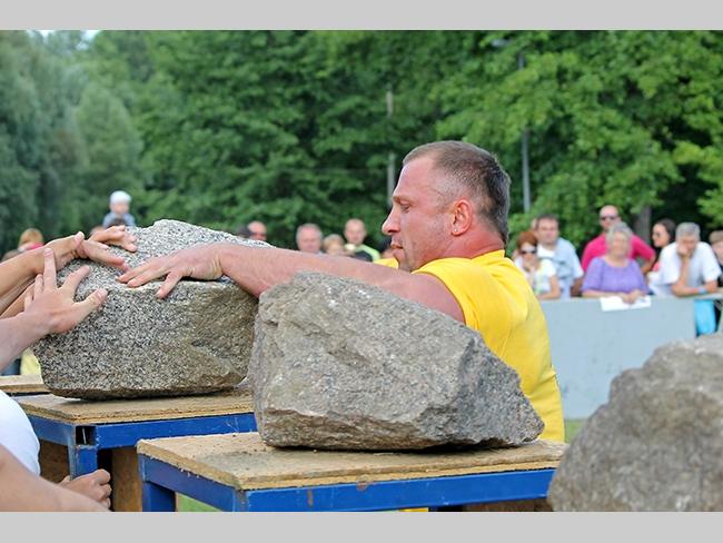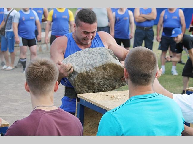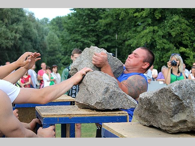 В упражнении «Каменщики» спортсменам необходимо положить на тумбы четыре камня весом 70, 80, 90 и 100 килограмм, как можно быстрее.