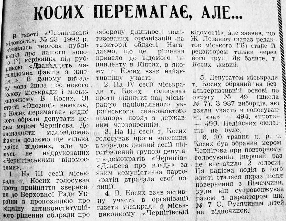 Энергии представителя Президента в Черниговской области можно было только позавидовать. Мало того, что Валентин Мельничук, управляя крупным предприятием, встал у руля всей области, вдобавок к этому на внеочередной сессии городского совета, которая прошла 20 мая 1992 года, предложил депутатам доверить ему выполнение своих прежних обязанностей, т.е. руководить и областной администрацией и по совместительству, еще и городским советом. Но депутаты горсовета решили не идти на такой эксперимент и до официальных выборов мэра города, решили выбрать мэра «временного», из своих рядов. Со второй попытки, победу одержал бывший комсомолец и коммунист Виталий Косых, который вместе с Валентином Мельничуком стал ответственным за все то, что происходило в городе Чернигове и в Черниговской области.