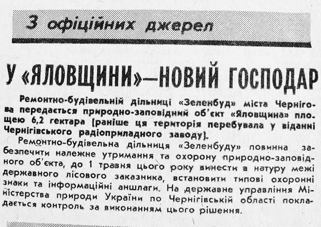 В обзоре прессы за 1991 год мы писали о том, что проблемы у «Яловщины» появились еще задолго до обретения Украиной независимости. А вот в 1992 году более 6 гектаров «Яловщины», которые имели статус не какого-то там РЛП, а государственного лесного заказника (!), передали РСУ «Зеленстрой». О реальных последствиях «хозяйствования» «Зеленстроя» на землях заказника и прилегающих к нему участках, в последнее время сказано и написано очень много.