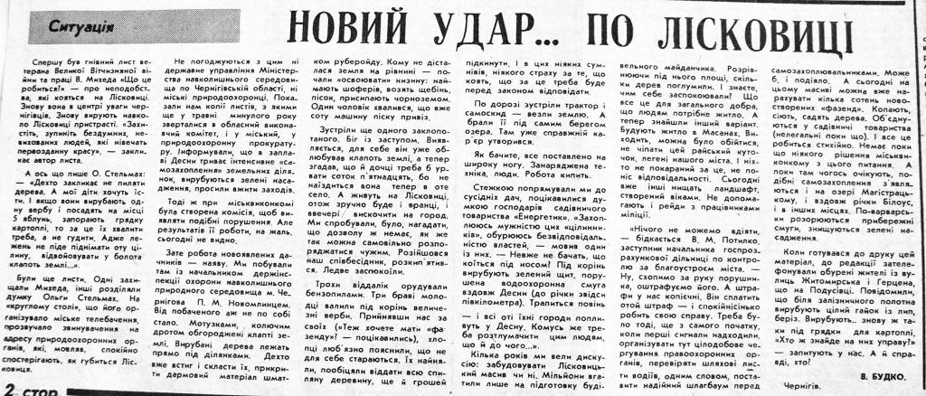 Как известно, спустя некоторое время после провозглашения 24 августа 1991 года независимости Украины – деятельность коммунистической партии в нашей стране была запрещена. Черниговская партийная номенклатура пошла на заслуженный отдых. А вот место для «заслуженного отдыха» партийные чиновники, как оказалось, выбрали себе еще заранее, посчитав, что своей партийной работой они «заслужили» отдых, достойный их трудов. 20 гектаров леса на берегу Десны было уничтожено, некогда зеленая прибрежная зона превратились в одну большую строительную площадку, где самые лучшие участки заняли бывший глава Черниговского райисполкома партии – Полковниченко О.П, второй секретарь Деснянского райкома КПУ, бессменный руководитель фабрики «Сиверянка» - Лавренюк О.Ф. , «герой колбасной революции» - Л.И. Палажченко, даже ректор ЧГПИ, биолог, который по идее должен был бы относиться к природе с должным уважением, Александр Явоненко и тот не отказался от «лакомого куска» прибрежной земли.