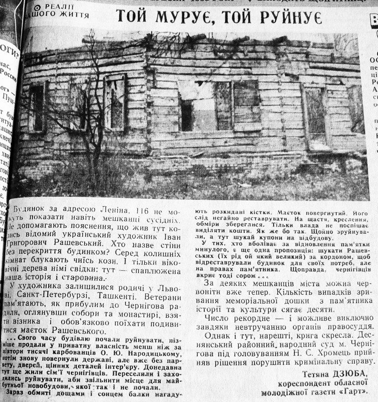 Писали мы в прошлый раз и об участившихся случаях дикого вандализма, которые прокатились Черниговом. Вандалами выступали, как и сами жители нашего города, так и органы местного самоуправления, которые целенаправленно уничтожали историческое наследие города. Если в 1991 году местная власть уничтожила два уникальных деревянных строения своими действиями, то уже в 1992 году, памятки архитектуры уничтожались бездействием тех же властей.