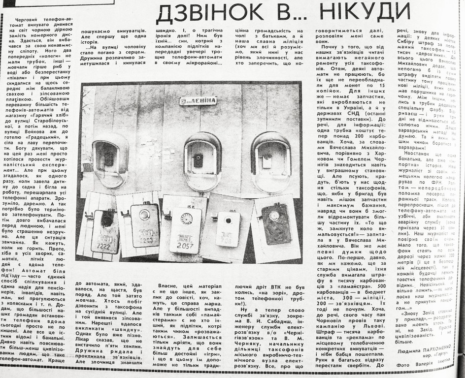 Следует заметить, что первый телефонный звонок с мобильного телефона в Украине был официально совершен 1 июля 1993 года, но даже в конце 93-го года, по всей Украине насчитывалось менее 3 тысяч абонентов, которые могли себе позволить оплачивать многотысячные долларовые счета за мобильную связь. И поэтому отсутствие телефонных трубок у черниговских таксофонов можно смело было назвать катастрофой городского масштаба. Если в центре города прохожему стало бы плохо или на кого-нибудь было бы совершено разбойное нападение, то оперативно вызвать скорую или милицию было бы очень проблематично.
