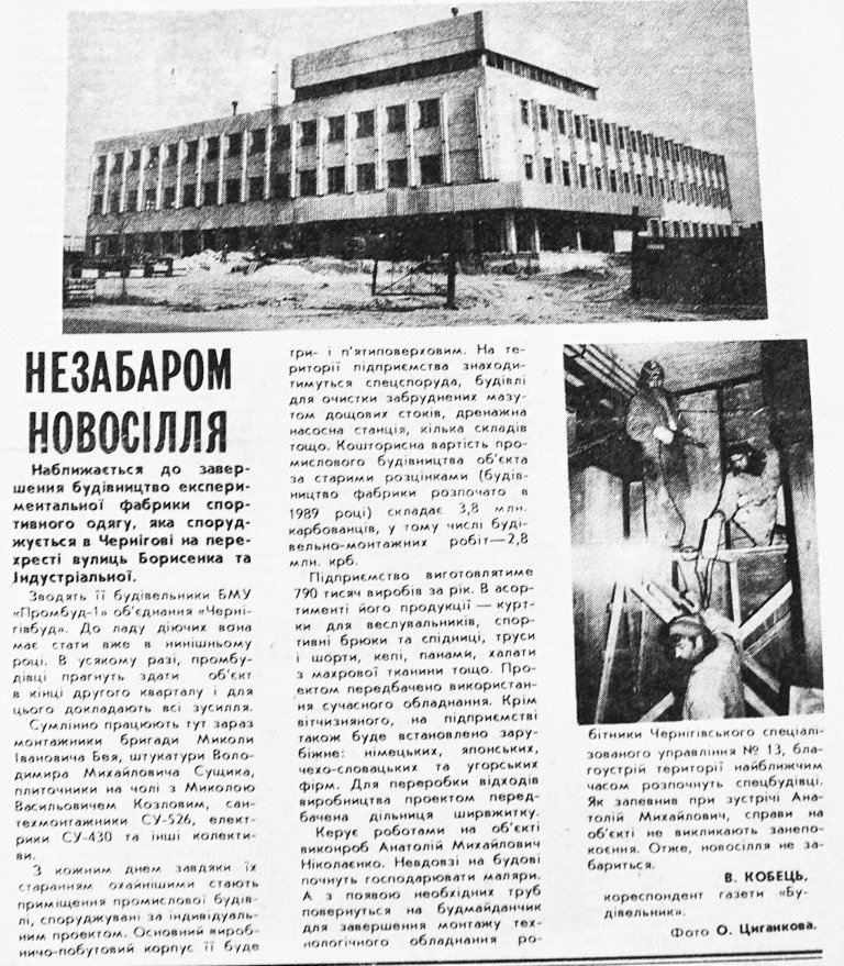 Также на углу улиц Борисенко и Индустриальной завершались работы по строительству экспериментальной фабрики по пошиву спортивной одежды, где планировалось производить 790 тысяч изделий в год, среди которых были бы куртки для гребцов, спортивные штаны и юбки, кепки, панамы и махровые халаты. Но эксперимент окажется неудачным и фабрика не окажется готовой к конкуренции с китайским и турецким товаром, которые спустя некоторое время заполнят украинский рынок.