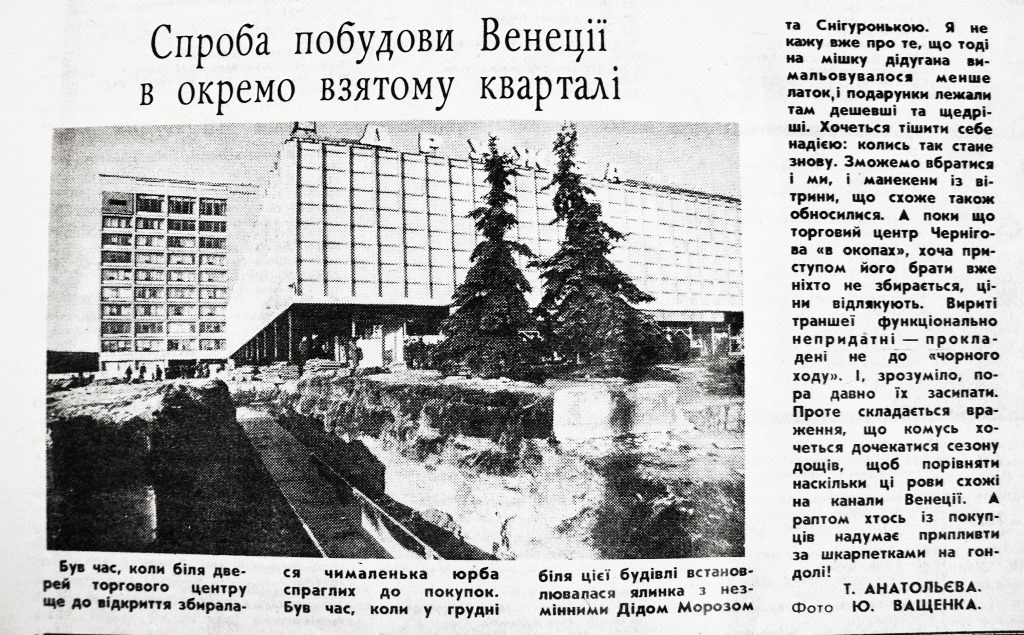 А так выглядела территория возле торгового центра «Дружбы», где коммунальные службы прокладывали коммуникации, но делали это не так оперативно, как следовало бы, поэтому и стали раскопки объектом иронии журналиста одной из черниговских газет.