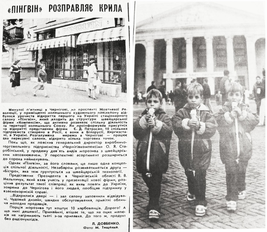 А любимое мороженое всех маленьких черниговцев - «Пингвин», которое изначально продавалось в ларьке возле того же ТЦ «Дружба», в 1992 году стали продавать в стационарном закрытом помещении. Отныне лакомство продавалось в специализированном магазине, который открылся в помещении по проспекту Октябрьской революции, возле салона «Чаривниця», где раньше располагался художественный павильон.
